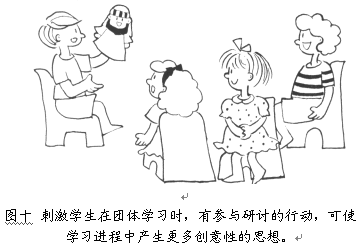 6.刺激学习者于团体学习时付诸参与研讨的行动。团体学习(如:小组)不仅能达到彼此刺激的集思广义学习果效,在整个学习的过程中,亦可能激发出更多创意性的思想,并形