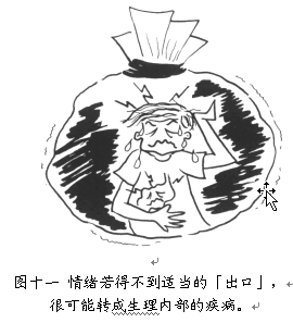 情绪若不得妥善地处理,也就是说未得正确的「出口」或回导,皆有可能转变成生理内部的疾病。由于身体与心灵密切「合作」(结合)的缘故,情绪在未得妥善处理的情况下,很可能头疼取代了愤怒;溃疡取代了悲伤;盗汗取代了焦虑。