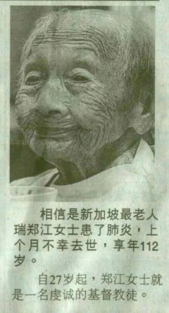 新加坡最老人瑞上个月不幸因肺炎去世。