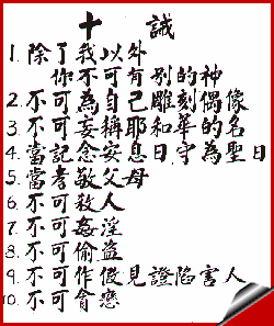 折叠桌上,平放着父亲最后为主日学学生,所书写的「十条诫命」。旁边堆放着一大落墨宝,多是为主日学课程所预备的金句、诗歌,还有亲手绘制的圣经地图。 |