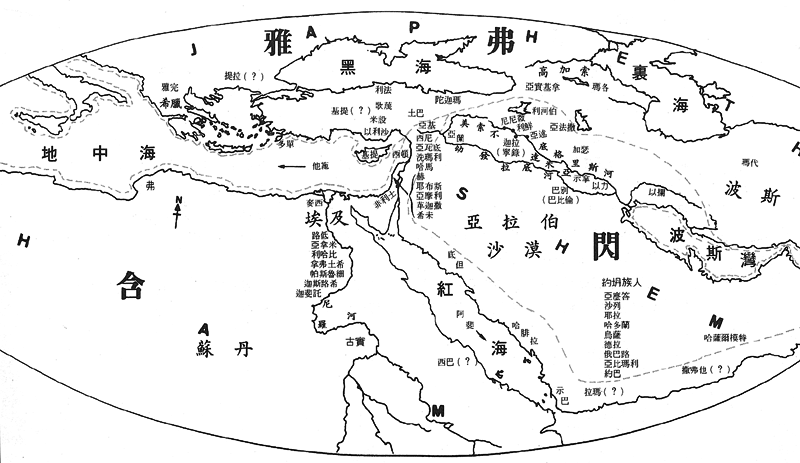 为使读者明了本章所记述的挪亚的三个儿子之后裔,分地居住的状况,以及其以两河流域为以色列人祖先的来源,并为太古史记述的中心起见,我们特简绘一示意图于后,作为参考之用: