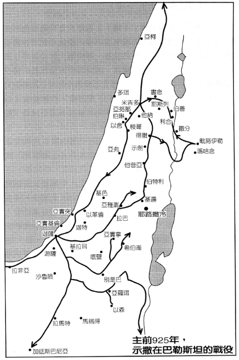 参:下面地图。这是罗波安治下惟一的一件被视为是神的刑罚,并导致暂时改革的政治事件(代下十二2~12)。示撒(Sheshonq I,Shishak)建立了埃及(Libyan)第 XXII 王朝(主前945~924),他在此年(主前925年)入侵巴勒斯坦之作战记录证据充足,刻在埃及底比斯(卡纳克)的亚孟之庙中269,其中所记载的地名有一百五十个,他的目的似乎是要重新掌握埃及对巴勒斯坦及南地主要商贸大道的控制。他带领一万二千二百辆战车及六十团(六万名)骑兵队横扫犹大地,搜刮劫掠,犹大王虽献上圣殿王宫里的宝物,却无法拯救耶路撒冷(26节,代下十二章)。埃及人犯境并在米吉多立碑之另一目的,可能是想要箝制耶罗波安。值得注意的是埃及人并未宣称掳掠耶路撒冷,一年之后示撒便去世了。有关这次战役的路线及罗波安在西南设下预防埃及再犯的防御(代下十一5~12),请下列地图270。这些防御工事也同时惠及后人。