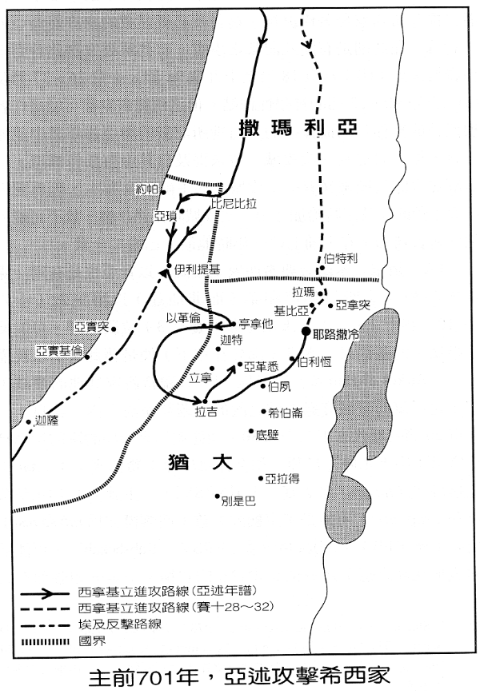 8. 击退非利士人收复亚哈斯所丧失的疆土(代下二十八18~19)。亚哈斯沦为亚述的藩属,希西家却寻求独立。他废去以革伦的 Padi,与亚实基伦的 Sidga 联盟,亚述年谱视此为反亚述的行动。迦萨则一直忠于亚述。