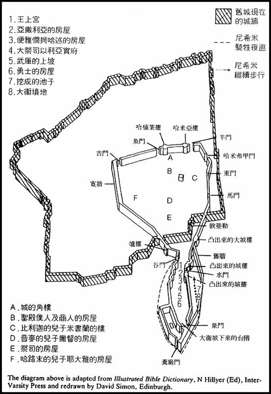 尼希米的夜行,附带给我们知道古代耶路撒冷的规画,为旧约里不多见的。这城受到在上建造的两座山的地形所限。这两座山自北至南,互相平行,中间有一个山谷,向东、西及南的山坡最险峻。东边的山是大王首先征服的地方;这城在君王时期逐渐开展至西边的山。尼希米的问题,或许不单是重建这城,还要决定他们是否将大王原来所建的,和以后扩建的,一并重建。