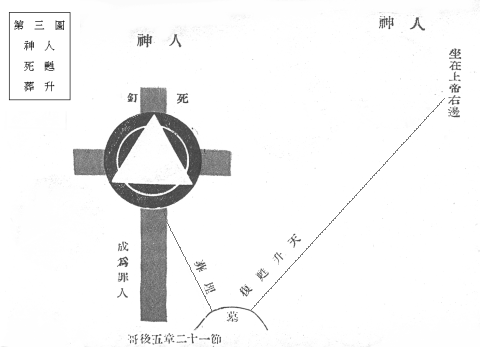 此图是表明信徒有两个地位,在是哥林多前书十五章廿二节已清楚说明。在这世间有两个代表人,是上帝要与他们交易的:一是亚当……是旧人的源头;一是耶稣……是新人的源头。罪恶是从亚当起首,救恩是由耶稣而来,罪人是在亚当里面……深黑的圆形里;信徒是在基督里面……黄金色的圆形里。在亚当里面是由欲情而来,在基督这里面是由恩典而得。在亚当的生命是由人而生,在基督的生命是由神重生。由亚当人皆有罪受死,由耶稣人可得救得生。同在亚当为死亡黑暗,在耶稣为生命光明。各位不在亚当里面,就在耶稣里面,你与耶稣同葬升天,便知你是在甚麽地位。