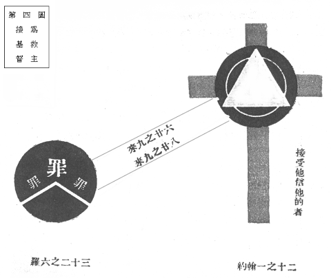这图左方的圆形是表明人罪的情况,十字架上的金色叁角形是表明基督乃荣光的主,是神的儿子,他离天上的荣位降生成为人,负世人的罪钉上十字架,所以金色叁角形外的黑圆形,是基督因我侪而成为罪人的意思。基督本无罪,但他因是救主,要担罪人的罪,世人所有的罪都尽负之於十字架,所以圣经明言他无罪而成为有罪,他负罪在十字架时,甚至父神也离了他。