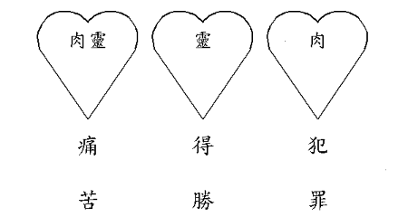 一切善的感动,都是从上而来,圣灵在我们灵里说话。反之,一切恶的意思,都由身体而入,魔鬼借人的肉体入到人的魂里,使人里面起了大的冲突。保罗在罗马七章尝述说这种冲突和痛苦。最後他说:「我真是若啊!谁能救我脱离这取死的身体呢?」但其後保罗已明白这个道理,在加拉太五章可以见到。罗马八章十二,十叁节他亦明白宣布说:「弟兄们,这样看来,我们并不是欠肉体的债,去顺从肉体活 。你们若顺从肉体活 必要死,若靠 圣灵治死身体的恶行必要活 。」罗马六至八章这个灵历的演进,我们若不明白,是为最大的亏损。罗马一至五章论救恩,六至八章论战争。六章是论战争得胜的原理,七章是论战争失败的经验,八章是论靠主得胜的经验。保罗能把肉体挂在十字架之上,故能天天过 得胜的生活。