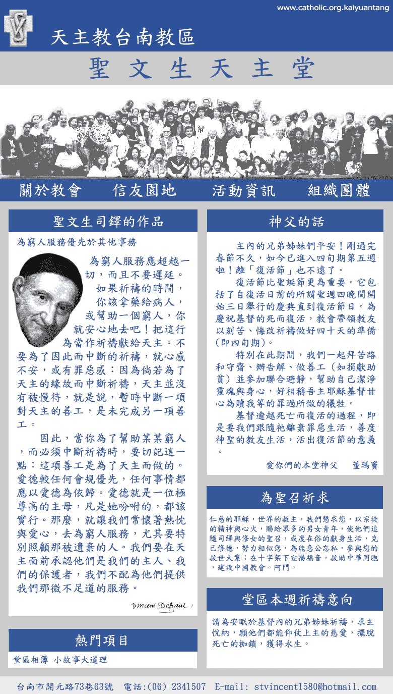 看弟兄們同在一起 是何等喜樂 ! 觀看每期堂訊中神父對我們所說的話 聯絡開元堂 開元堂地圖 進入台南教區首頁 進入主教團網站首頁 回首頁 主教團網網相連