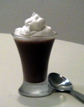 1. 把鸡蛋,巧克力,1汤匙砂糖,兰姆酒及盐放入搅拌机打匀。 2. 把牛奶煮热,慢慢倒入搅拌机再打匀,约1分钟。 3. 把巧克力浆倒入6个小杯,放入雪柜冷藏4小时以上(最多2天)。 4. 吃前,将纯奶油加2汤匙砂糖搅拌,再加在巧克力上。