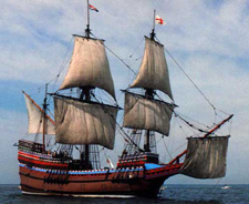 五月花”号帆船,仅约九十尺长,载重约180吨。在海上遇到波浪,颠簸艰难可以想见。他们的目的本来是往维钦尼亚,但经过六十六天的航程,十一月二十一日(旧历十一日)到岸,在今麻萨诸塞州鳕鱼角(Cape Cod)附近登陆,那地方就是朴莱茂茨磐石(Plymouth, Provincetown)。