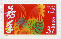 这些年来,美国邮政局华人阴历新年期间,发行十二生肖邮票。今年是乙酉年,是鸡年。