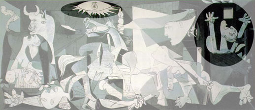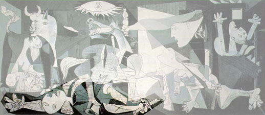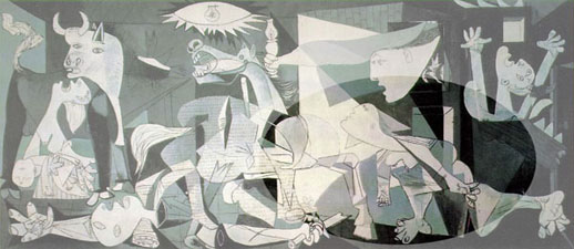 1937年西班牙内战其间,德国战机应西班牙国民军政府的要求,向巴斯克城市格尔尼卡猛烈轰炸,造成严重伤亡。毕卡索激于义愤,绘画了这有如炼狱般的惨状,著火的房子,惊惶失措的人畜,嚎哭的丧子之母,控诉著战争的残暴。为此,毕卡索与独裁者佛朗哥(Franco)决裂,流亡至巴黎,老死不还乡。