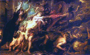 她赤裸上身,没有穿鞋,一只断掉的左腿留在画的右侧,她屈著身体,垂著双手张皇失措,拼命地逃跑,同时眼睛又紧紧注视著上前方落下的炸弹。这个妇人形象是取自鲁本斯的名画“战争恐怖”(右图)。