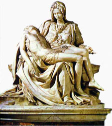 她跪在牛前,脸也朝著天上投下炸弹的方向,手里抱著死去的孩子,张大著口,悲痛的吼叫,.和右边的女人一样,她的眼睛也离开了正常的位置,化成眼泪的形状,正如欲哭无泪的表现。这个组合取材于古义大利画的“哀痛的圣母”。米开朗基罗就有一幅极著名的雕塑“哀悼基督”,直立而坐的圣母和横抱的基督尸体构成一个十字,俱有极大的震撼力。(见右图)