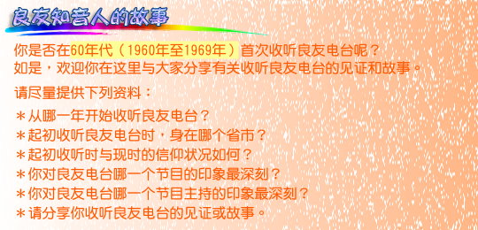 背景是在1962年,因受人的 诬陷,我家房屋被没收,全家人只好住在一个破‘寺堂’里,我爸从教师队伍里被开除工作。那时侯我8岁,心灵受到极大的伤害。接着1966年的文革中我爸又被打击,无故的妈也被游街示众,又多次被抄家。12岁的我心灵再次挫伤‘天无宁日’。正值我情绪十分低落时侯的1968年,我14岁,我姐有了个‘红波’小型收音机。从此,良友电台的福音广播带给了我人生的一线曙光。广播里向我介绍了耶稣基督是人类的救主,真神上帝是创造万物的主,我们应当要敬拜他,赞美他。我也听到祷告唱诗的声音。并且有男女声多声部和唱的诗歌,圣结庄严、宏伟隆重、亲切又温和,给我带来了好心情。把我引进了世界的另一个境界,在我的心灵里面感应了一门新的哲学。我自问,‘这个世界难道真的有造物主吗。’其实我也真的希望这个世界能有一位主持正义的主,会给我美好的明天。只是在那‘破旧立新’的年代里不敢声张。