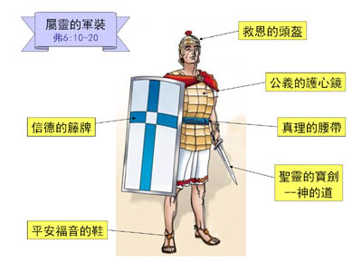 我们一一来看属灵的全副军装:腰带、护心镜、鞋、藤牌、头盔、剑。