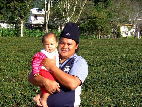 图为古志明弟兄和他的神迹茶园,茶园已经采收过了还有这么多叶子,真是奇妙啊!