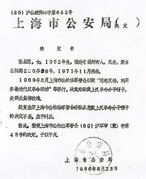 這四十多年,對於大陸的基督徒,特別是倪柝聲的家族,是一場嚴重的試煉。回想起大舅媽身上的鞭痕纍纍,連眼鏡都沒有完整的一副,病重不准醫院收進病房,她是在中山醫院的走廊上離世的。死後連抬屍體的工友都不來,不禁常常想起大舅媽生前常說的一句話:“如果沒有主,這世界真是太殘酷了!”在她去世十五年之後,上海市公安局寄來一份平反證明書,內容是:“把張品蕙定為反革命分子是不恰當的,應予以平反。”可惜她已死了十五年了!大舅媽堅持不放棄信仰,堅持不和大舅離婚。他們都逼她和大舅離婚,要她劃清界線!她為主打了美好的勝仗,堅固了許多弟兄,大大的榮耀了主名!寄上平反書。