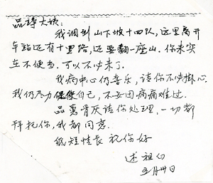 我調到山下坡十四隊,這裏離開車站還有十里路,還要翻一座山。你來實在不便當。可以不必來了。