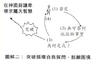 (4)再次回到否認:人在“為甚麼”裏找不到答案,就會從“否認”再開始另一連串的循環自我質問,落在痛苦憂鬱中。