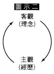 當人致力於屬靈操練時,主體與客體的角色上有了改變。讀經,禱告時,人成了客體,而聖經成了主體。人嘗試明白神的話,默想神的話,回應神的話和渴望生命經歷神時,人就成了主體,耶穌成了客體。這種主體與客體的交換,就構成了主體與客體之間交流的客觀性(參看圖示一)。因人不但經歷了“耶穌愛我”,也回應了“我愛耶穌”,在靈命操練上這是兩個主體,同時也是互為客體的屬靈交流。